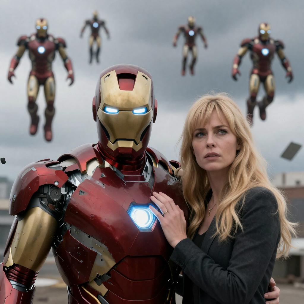 Futuristic Scene with Man and Iron Suits