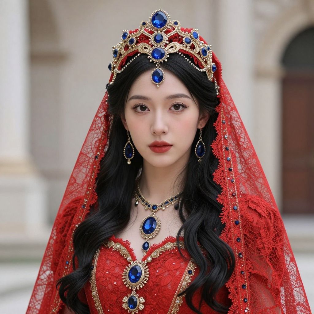 Digital painting of an Asian woman with long black hair, wearing a red lace veil, blue gemstone tiara, and matching dress, adorned with intricate