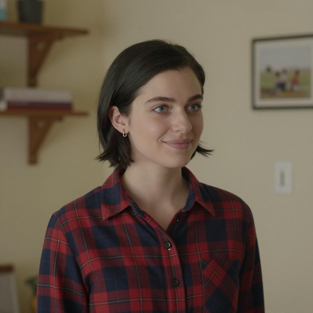 Woman with long brown hair, wearing a light gray jacket and dark dress, sitting on a metal bench behind a chain-link fence. She holds a yellow object in both hands, looking slightly down. A person with brown hair, seen from the back, stands in the foreground. Blue tarp covers the background.