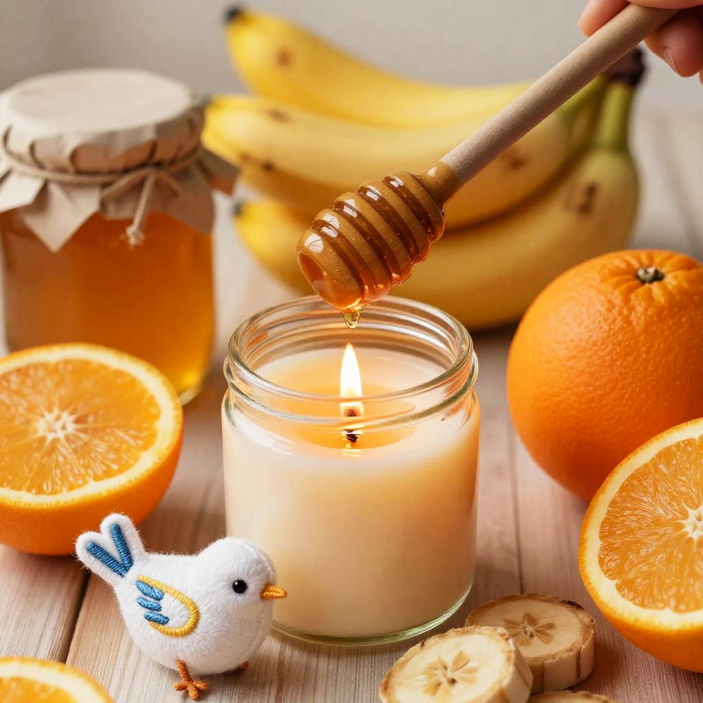 A warm, cozy photograph featuring a honey dipper in a small glass jar, resting on a candle with a flickering flame. Surrounding the candle are bright orange and yellow fruits, including a honey jar, sliced bananas, and whole oranges. A small, white, embroidered bird ornament is nestled near the front. The background is softly lit, enhancing the golden hues.
