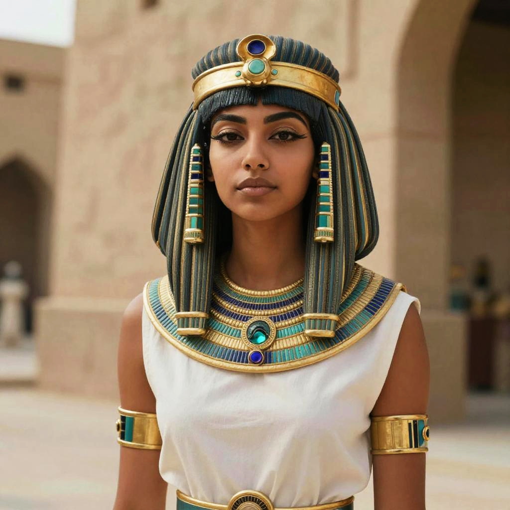 Digital artwork of an Egyptian woman with dark skin, black bob haircut, gold and turquoise headdress, white sleeveless top, adorned with jewelry, standing