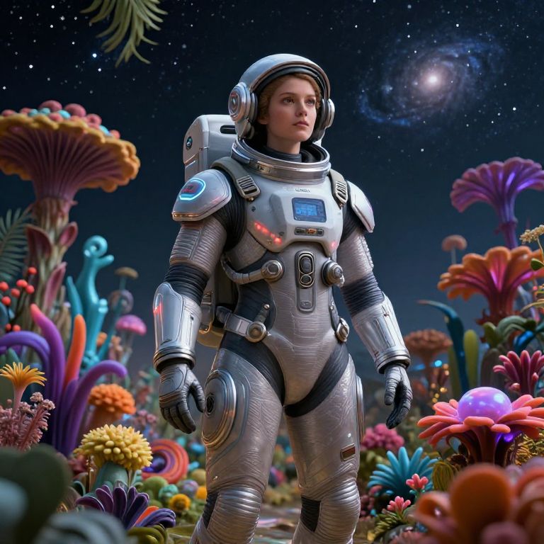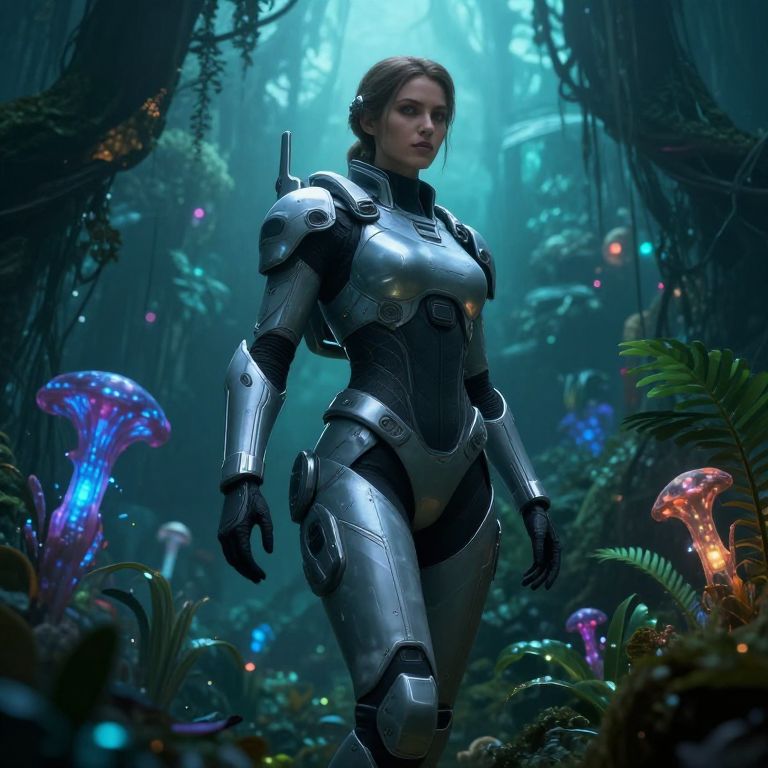 Female space marine in sleek exosuit exploring an alien jungle, bioluminescent plants surrounding her, mysterious atmosphere, high detail sci-fi illustration