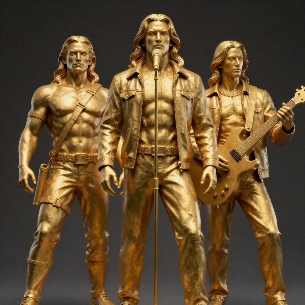 Golden statue of three musicians with long hair, standing side by side. Left: muscular, chest harness, serious expression. Center: tall, open jacket, holding microphone stand, intense gaze. Right: slimmer, holding guitar, relaxed pose. Dark gradient background.