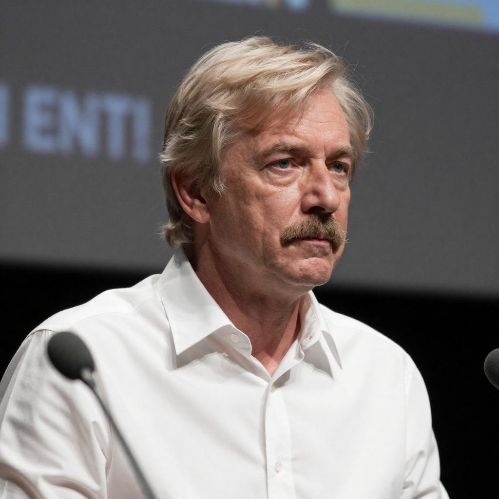 Photograph of a middle-aged man with light blonde hair and a thin mustache, wearing a white shirt, looking slightly to the right with a focused expression. He is indoors, with blurred dark and light background elements, including a microphone in the foreground. The lighting creates a high-contrast effect.