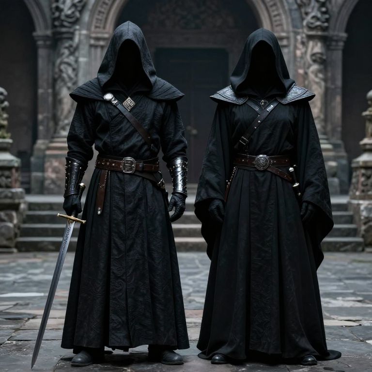 Two cloaked figures stand side by side in a dimly lit courtyard, their dark robes adorned with intricate leather accents and metallic gauntlets, as one holds a long, slender sword while the other stands guard, both shrouded in mystery against the backdrop of ancient stone architecture.