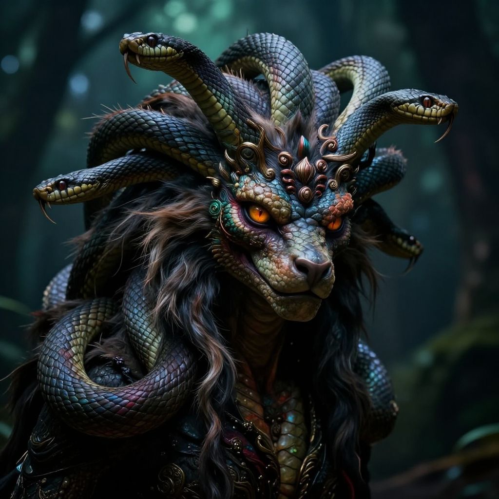 A digital fantasy artwork depicts a dark, mythical creature with a serpentine face and multiple snake heads emerging from its black, shaggy mane. The creature's intense, glowing orange eyes and scales that shimmer in hues of green and blue stand out against a blurred, dark forest background. The snakes, with intricate patterns and sharp eyes, coil around its head and neck, adding a sense of movement and danger. The texture of the creature's fur and scales is highly detailed, enhancing the otherworldly and menacing appearance. The overall mood is dark, mystical, and eerie.