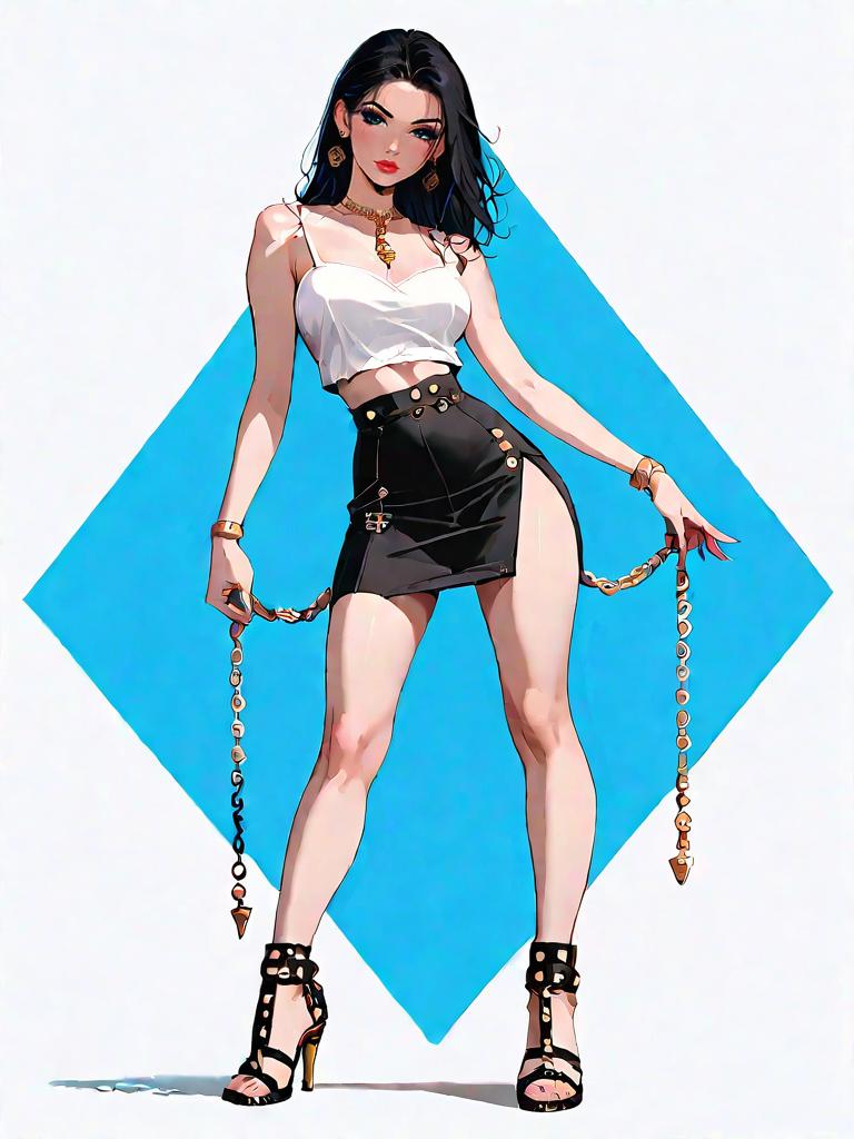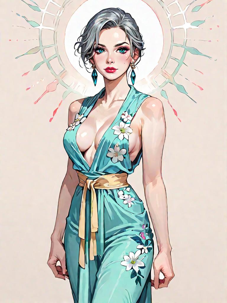 Digital illustration of a woman with dark hair in an updo, wearing a modern chic sleeveless blue dress with a deep V-neckline and double-breasted decorative buttons. The dress is cinched at the waist with a wide black belt, featuring a high slit showing one leg. She accessorizes with large hoop earrings, a choker, and matching blue heels. The background is a soft studio setting with subtle floral design elements.
