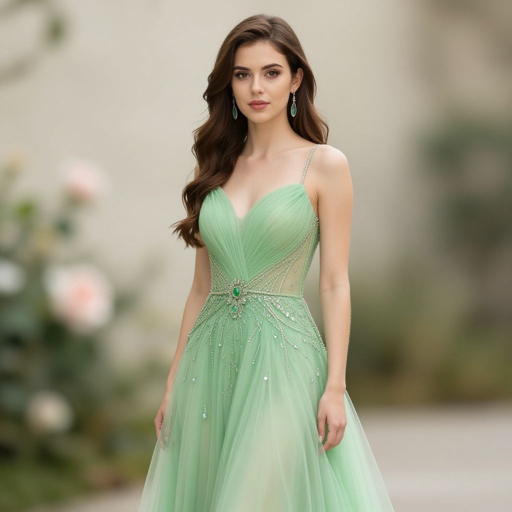 Green fairy prom dress, 1girl, solo, dress, green dress, jewelry, long hair, earrings, blurry background, blurry, brown hair, looking at viewer, flower, realistic