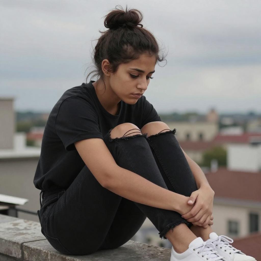 Black hair emo girl sitting on the steps of a graffiti-covered skate park, twilight sky casting a soft glow, wearing a striped long sleeve shirt and fingerless gloves, headphones around her neck, holding a notebook filled with lyrics, a contemplative and creative mood.