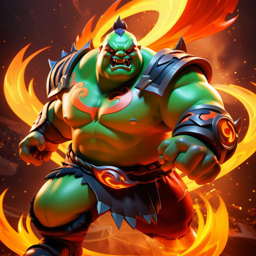3D rendered image of a muscular green orc warrior with spiked armor and tribal tattoos, surrounded by swirling flames. The orc has a mohawk hairstyle and an aggressive pose, emphasizing strength and power in a fantasy battle scene.