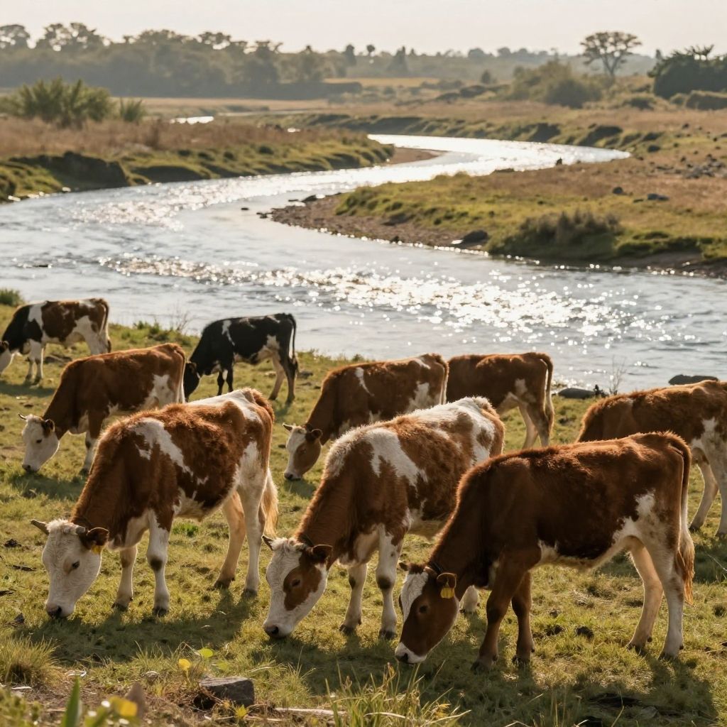Grazing Calves by Sparkling River