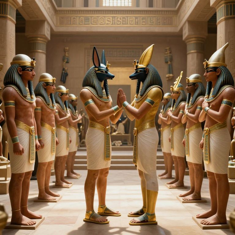 This is a CGI image depicting a ceremonial scene in an ancient Egyptian-style temple. At the center, two anthropomorphic jackal figures, resembling Anubis, stand facing each other with hands in prayer. Both wear golden headdresses, armlets, and anklets, along with white kilts. They have dark blue striped hair and brown skin. Surrounding them are eight other male figures, also with dark blue striped hair, wearing similar golden headdresses and white kilts, but without armlets or anklets. They stand in a semi-circle, facing the central figures. The temple background features tall columns, intricate geometric patterns, and warm lighting. The overall color palette includes gold, white, and brown tones, creating a majestic and solemn atmosphere.