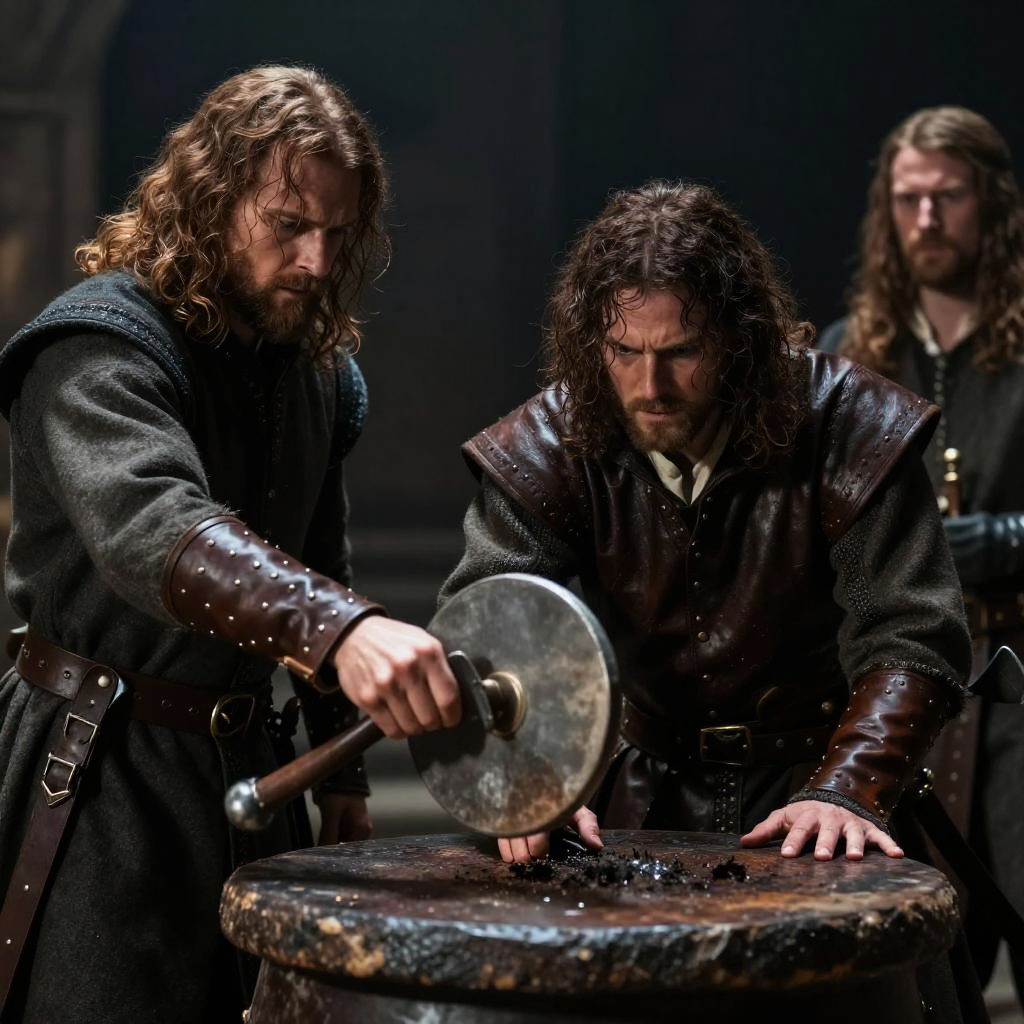 Whipping scene in a dramatic medieval setting, intense expressions, dark gloomy atmosphere, detailed leather and cloth textures, cinematic lighting, epic composition