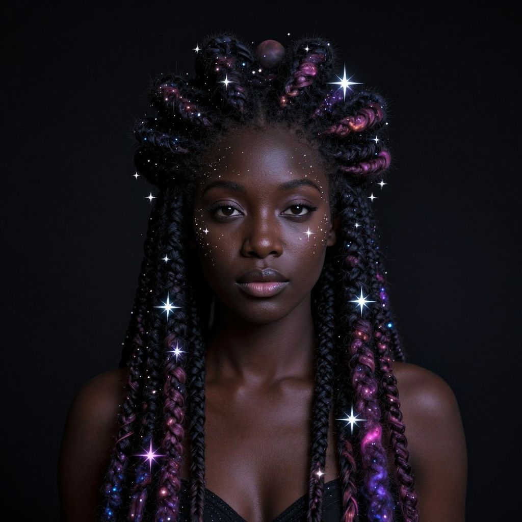 The image depicts a strikingly detailed and ethereal portrayal of a woman with an otherworldly appearance. Her hair, styled in intricate dreadlocks, cascades down, adorned with sparkling stars and nebula-like formations, evoking a sense of the cosmos. The woman's skin is a rich, deep shade of melanin, adding to the mystical aura. Her face is serene, with a calm expression, and she is adorned with delicate, sparkling star-like embellishments on her face and shoulders. The background is dark, creating a stark contrast that highlights the woman's features and the celestial elements in her hair. The overall composition is balanced, with the woman's figure centrally positioned, and the stars and nebulae adding depth and complexity to the scene. The image blends elements of fantasy and spirituality, suggesting themes of creation, the cosmos, and the divine.