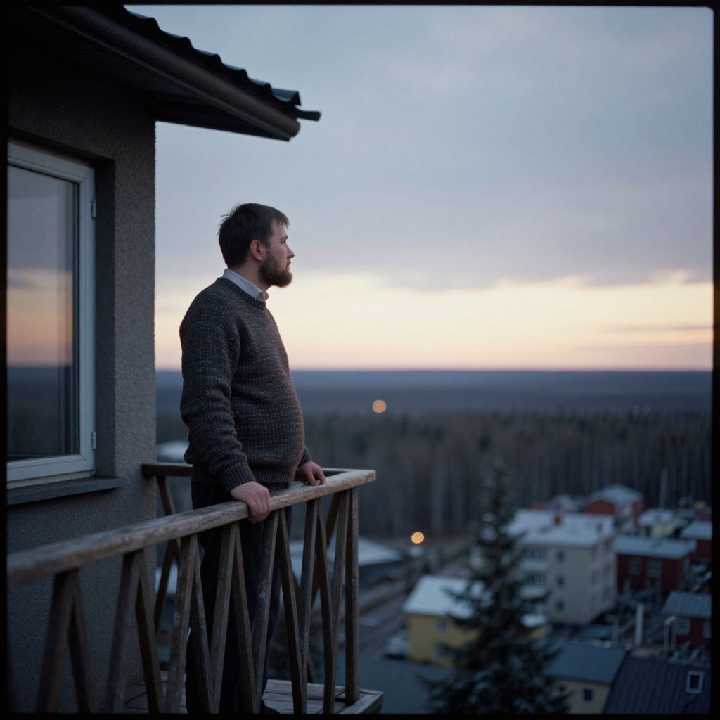 Photograph of a bearded man with short brown hair, wearing a brown checkered sweater over a white shirt, standing on a wooden balcony at dusk. He gazes to the right, hands resting on the railing. The background shows a distant forest and a small town with scattered buildings, under a blue and orange sky. The balcony is attached to a gray building with a window on the left. The image has a serene, contemplative atmosphere.