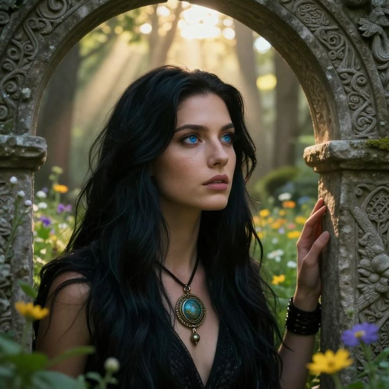 A portrait photograph showcases an enigmatic figure with captivating blue eyes and sleek raven hair, adorned with a mystical amulet pendant. Set against a mystical forest glade bathed in soft golden hour light, shafts of sunlight pierce through the trees to illuminate their serene expression. Gazing thoughtfully into the distance, one hand rests upon an ancient stone archway embellished with intricate carvings. The lush greenery and vibrant wildflowers create an ethereal contrast to the subject's striking presence, exuding a sense of otherworldly beauty that evokes both wonder and intrigue.