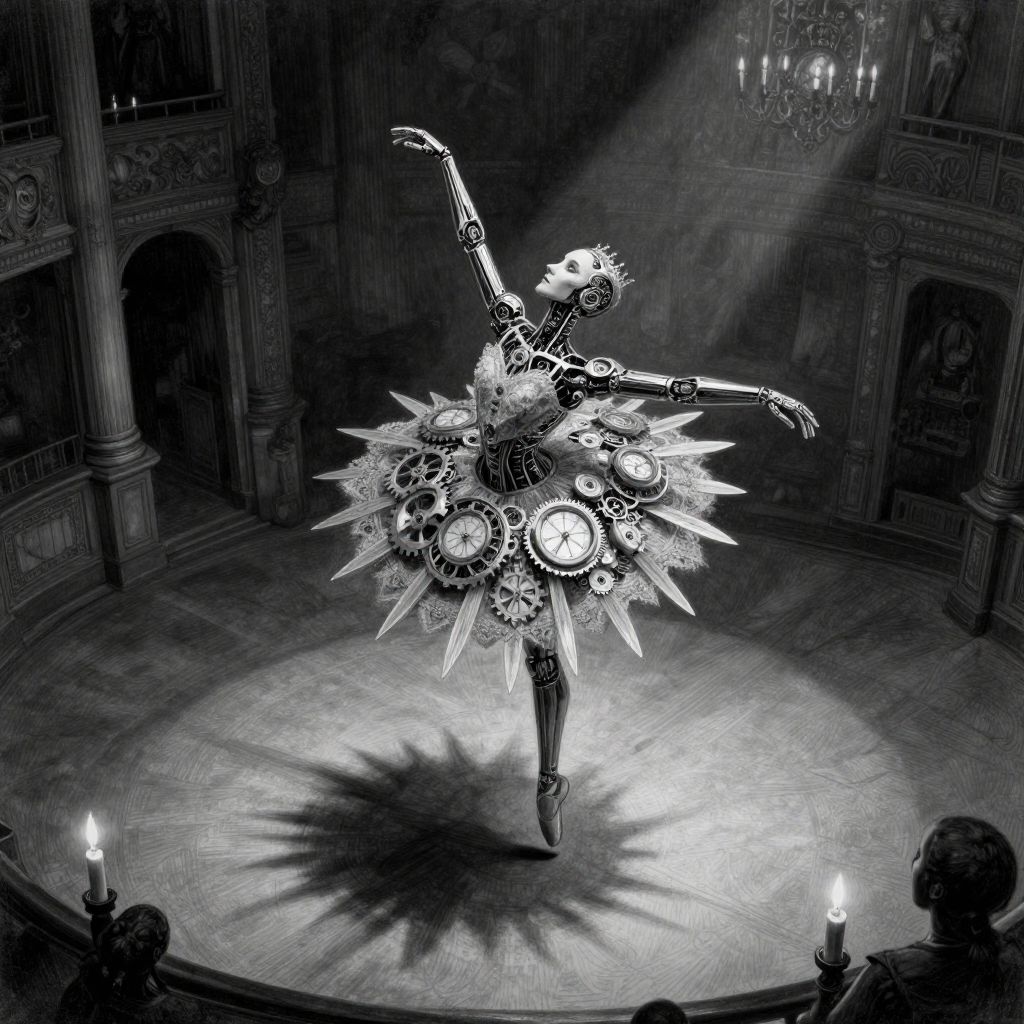 Monochrome digital drawing of a steampunk ballerina, adorned with gears and clockwork elements, performing in an ornate, dimly lit