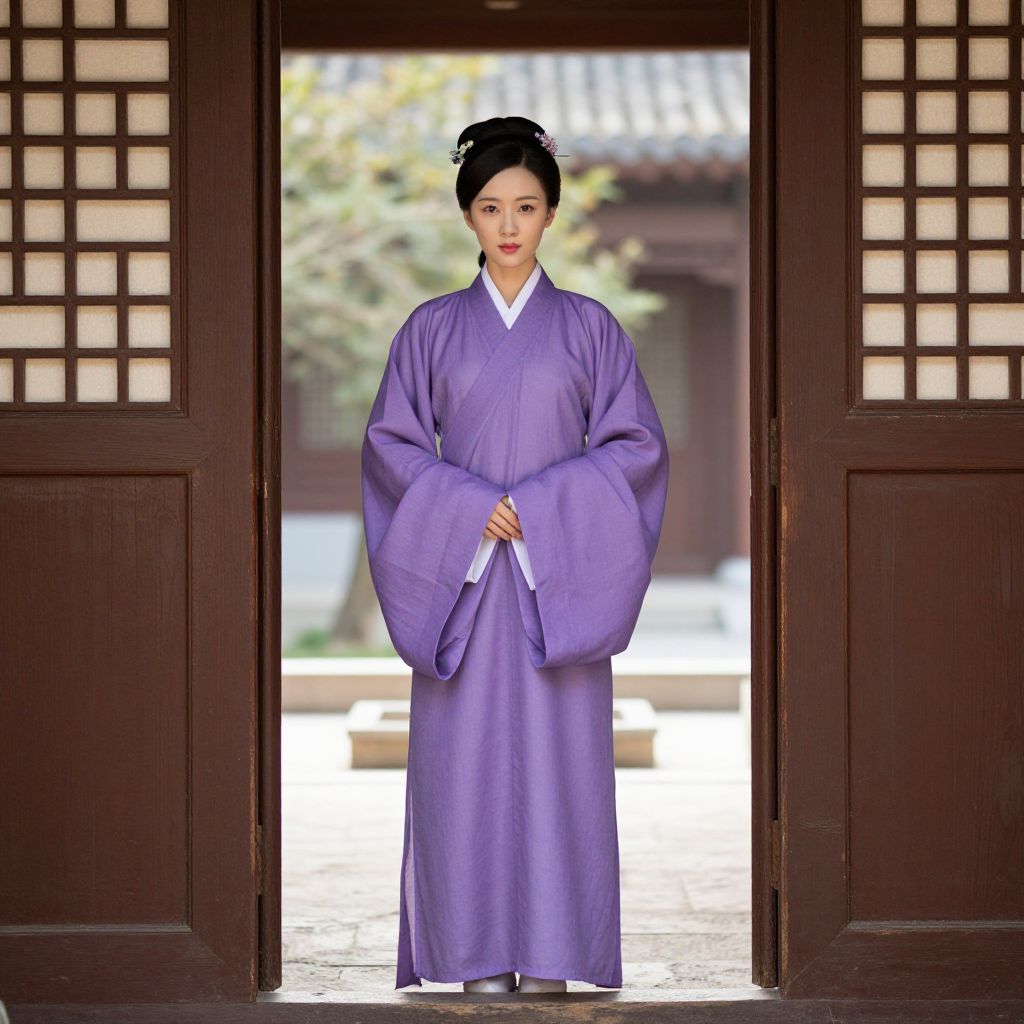 Simple Asian Costume, woman in a purple robe standing in a doorway