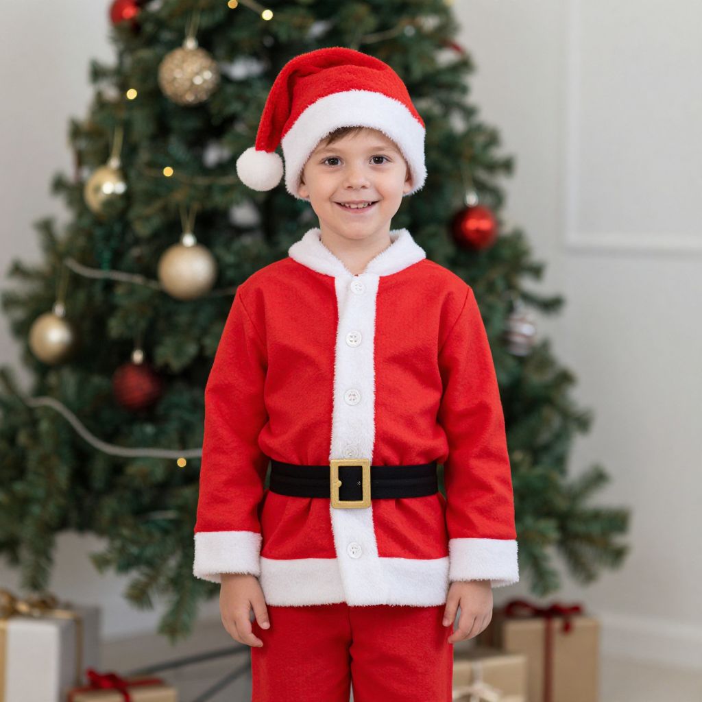 Santa Claus Costume Boy, boy dressed in a santa suit standing in front of a christmas tree
