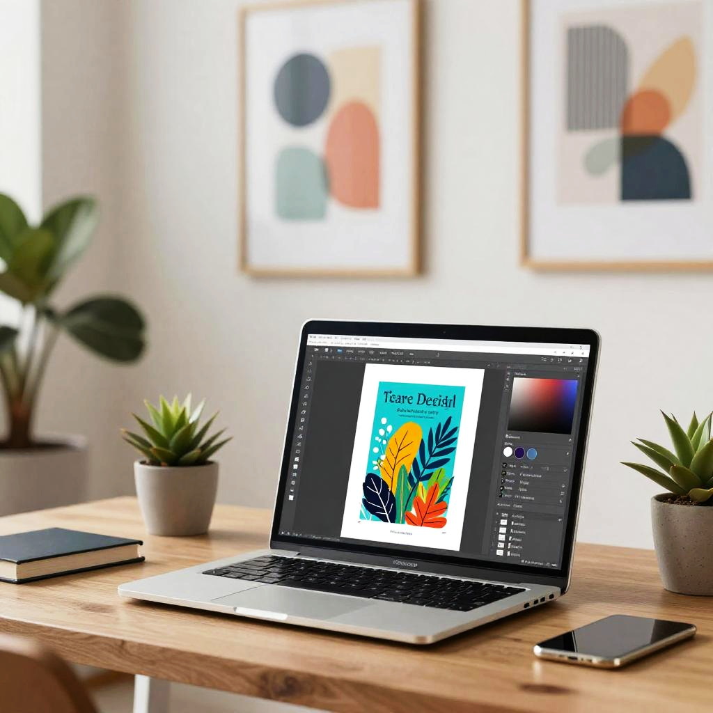 AI cover generator free theme, modern workspace with a laptop displaying AI-powered design tools generating colorful book covers, trendy minimalistic room with plants and art posters, soft natural lighting, creative professional atmosphere, digital art in progress