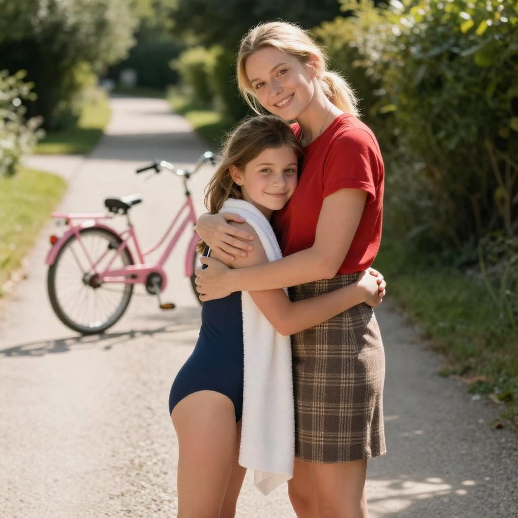 Photograph of a blonde woman with a ponytail, wearing a red shirt and brown plaid skirt, hugging a young girl with brown hair in a blue swimsuit and white towel. They stand on a sunlit, gravel path with a pink bicycle in the background, surrounded by lush greenery. The woman smiles warmly at the camera.