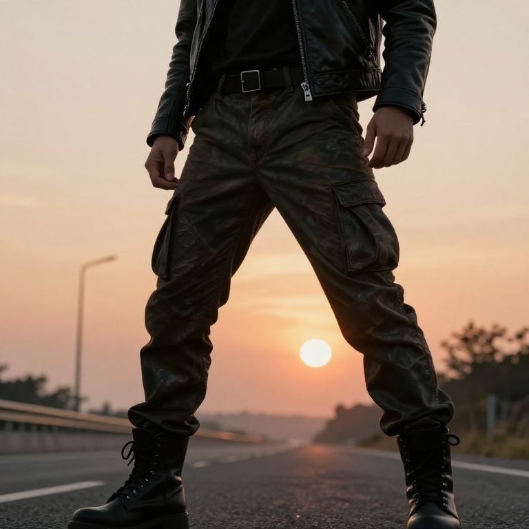 Cargo pants leather jacket combo on a biker, sunset highway, rugged textures, smoky atmosphere, cinematic vibe, warm tones, dynamic pose, heroic perspective