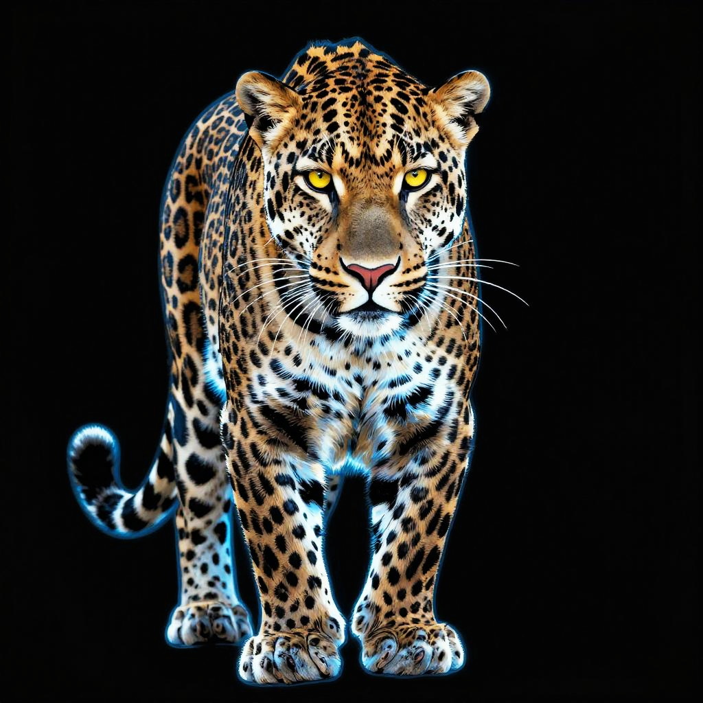 This is a digital drawing of a leopard in a neon blue glow against a solid black background. The leopard's spots and whiskers are intricately detailed, with its yellow eyes standing out prominently. The art style is bold and modern, using a high-contrast, glowing effect to create a striking visual impact. The leopard is facing forward, looking directly at the viewer.