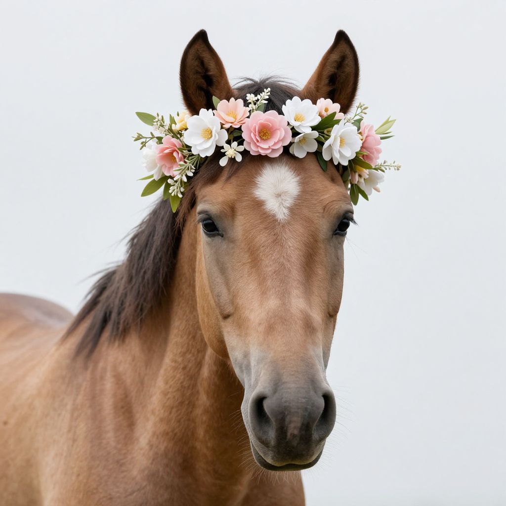 The image features a close-up of a horse's head adorned with a delicate floral crown. The horse has a light brown coat with a darker mane and tail. The crown is composed of soft, pastel-colored flowers, including pink and white blossoms, interspersed with green leaves and delicate petals. The flowers are arranged in a circular pattern, covering the horse's forehead and ears. The background is a plain, light gray, which accentuates the vibrant colors of the flowers and the horse's coat. The overall composition is balanced, with the horse's head centered and the floral crown adding a touch of elegance and natural beauty to the scene.