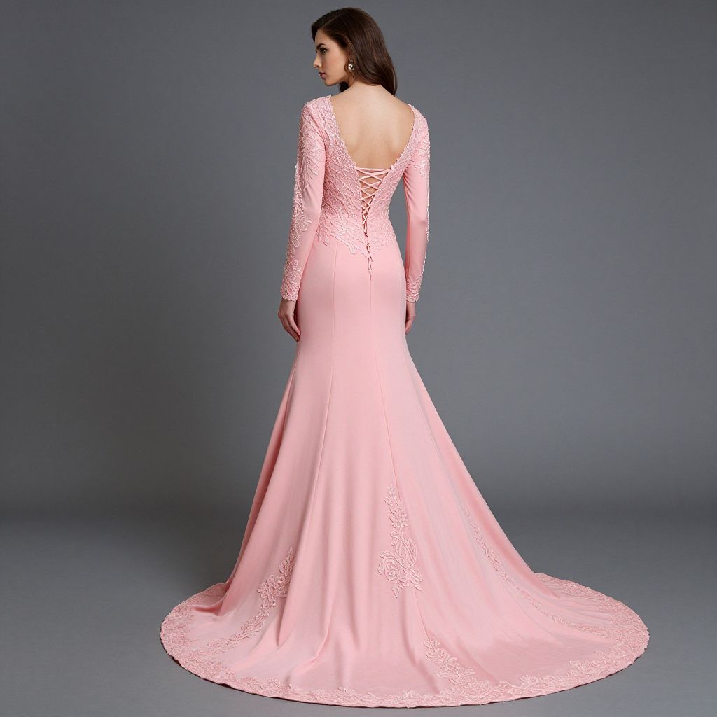 Elegant woman showcasing a stunning pink prom dress featuring long sleeves, an A-line silhouette, an O-neckline adorned with lace appliqués, and a sweep train, complemented by a delicate lace-up back design.
