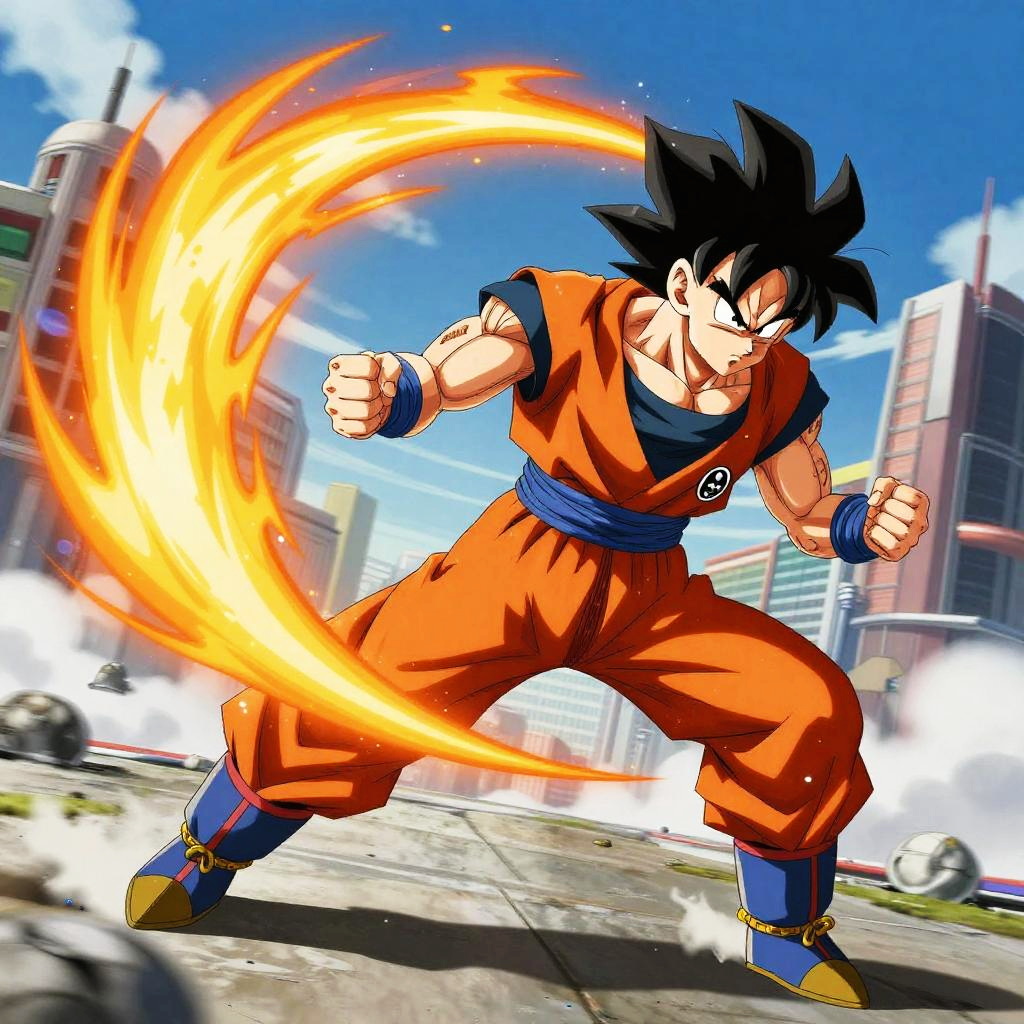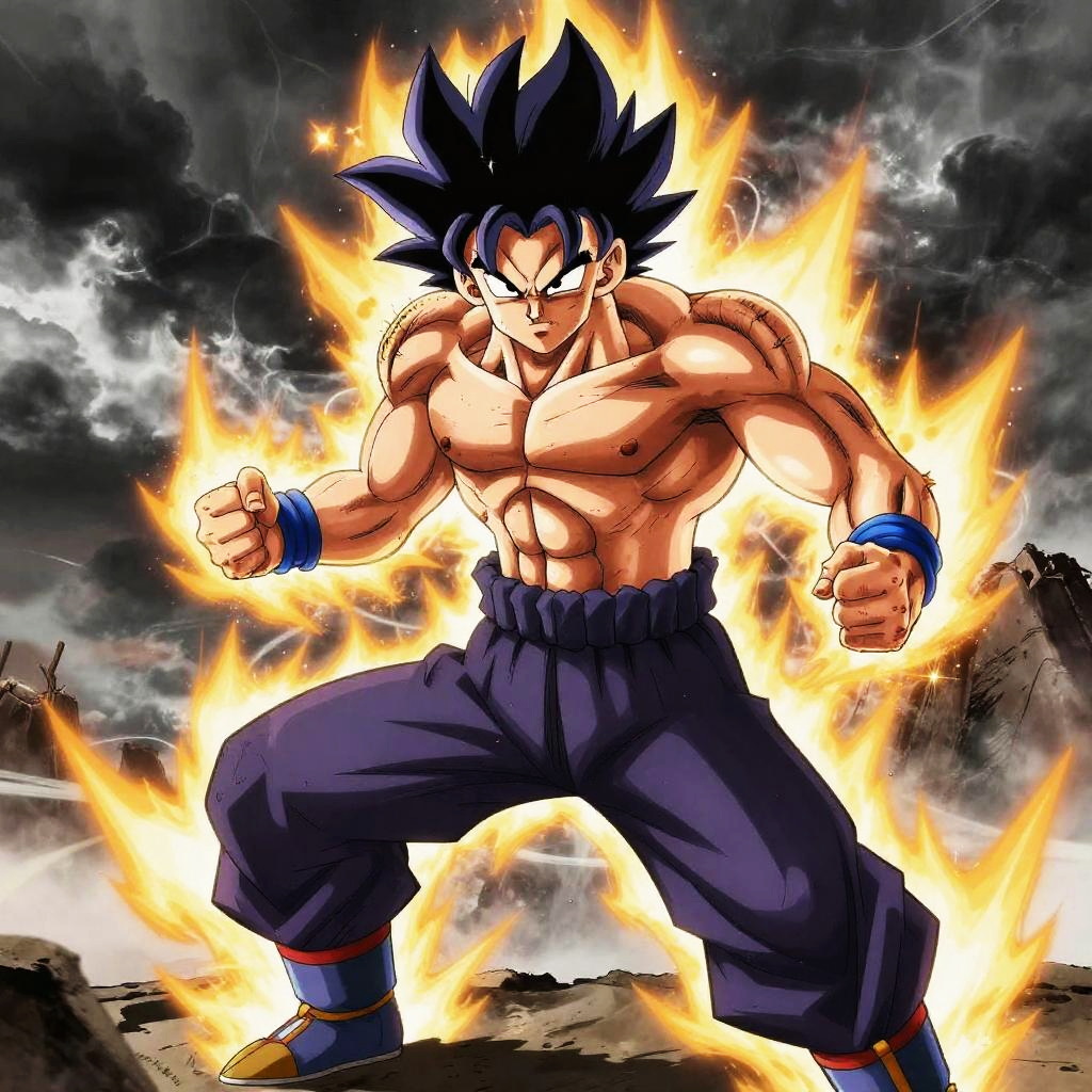 Dbz qui character intense battle scene, vibrant energy blasts around, dynamic anime style, detailed muscles and flowing hair, explosive background, vivid colors