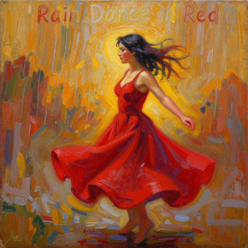 A vibrant figurative oil painting on canvas by Karen Tarlton, showcasing a dynamic \"Rain Dance in Red\" with bold, textured brushstrokes and impressionistic lighting effects, capturing the fluid motion of a woman twirling in a flowing red dress against a vivid backdrop of cascading rain and warm golden hues.