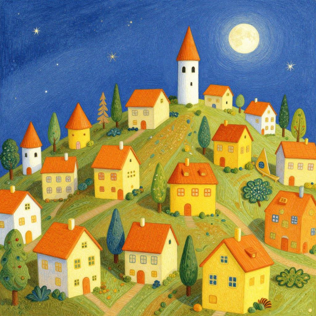 The image depicts a whimsical, brightly colored village nestled on a hill, reminiscent of the art styles of Klee and John Bauer, with a strong emphasis on children's illustrations. The village is composed of numerous small, rounded buildings with pointed roofs, painted in warm hues of yellow and orange, creating a cozy and inviting atmosphere. A prominent white tower with a conical roof stands out, serving as a focal point in the scene. The hill is adorned with a variety of trees and shrubs, adding texture and depth to the landscape. The sky above is a deep blue, dotted with stars, and a full moon casts a soft glow over the entire scene. The overall composition is balanced, with the village and its surroundings arranged in a harmonious manner, creating a sense of tranquility and wonder. The detailed textures of the buildings, trees, and ground, along with the vibrant colors, contribute to the enchanting and imaginative quality of the illustration.
