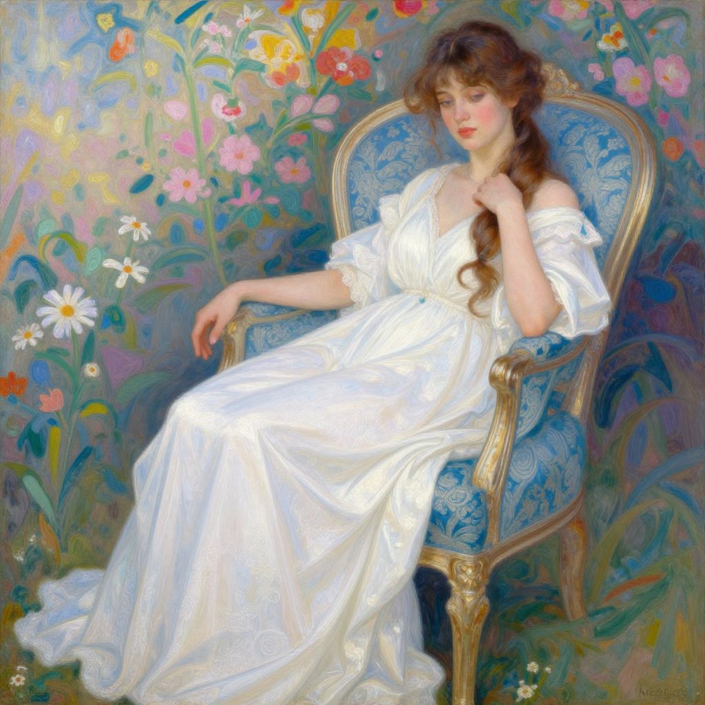 This digital painting depicts a young woman with fair skin and long, wavy brown hair, sitting in an ornate, blue-upholstered chair with gold trim. She wears a white, semi-transparent, lace-trimmed dress that flows gracefully to the ground. The background is a vibrant, colorful floral garden with an array of blooming flowers in shades of pink, yellow, red, and white. The flowers and greenery create a lush, textured backdrop. The woman's expression is serene and contemplative, with her gaze directed slightly downward. The overall style is reminiscent of 19th-century Romanticism, with a focus on delicate, ethereal beauty and natural elements.
