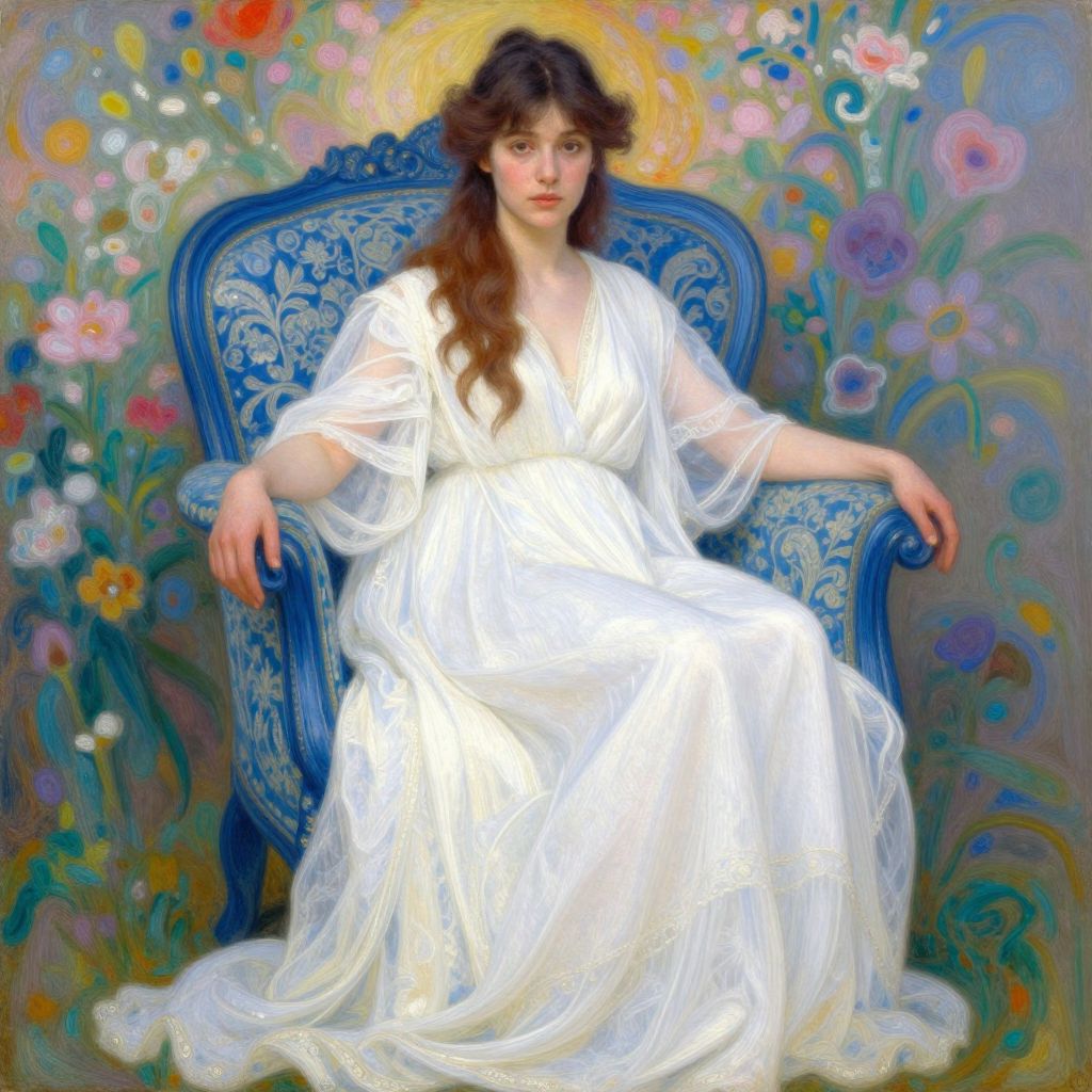A finely detailed digital illustration inspired by John Duncan's Symbolist style, featuring a young woman in a flowing white gown seated on an ornately patterned blue chair, set against a vibrant floral backdrop with a soft, ethereal lighting effect.