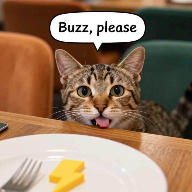 A curious tabby cat peeks over the edge of a wooden table, its head and upper body visible, The cat slipped its tongue, The cat has distinct stripes and large, expressive eyes, Text bubble above its head written \" Buzz, please\" In the foreground, a white plate with An object in the shape of yellow lightning icon and a fork are partially visible, The background features cushioned chairs in shades of orange and green, creating a cozy dining atmosphere