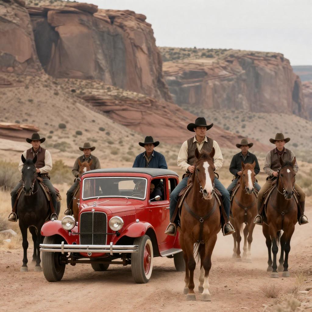 Photograph of six cowboys on horseback riding across a dusty, grassy plain with a rocky cliff in the background. The cowboys wear dark hats, white shirts, and chaps, with rifles slung over their shoulders. The horses are various shades of brown and black. The scene is dynamic, with dust clouds rising from the horses' hooves.