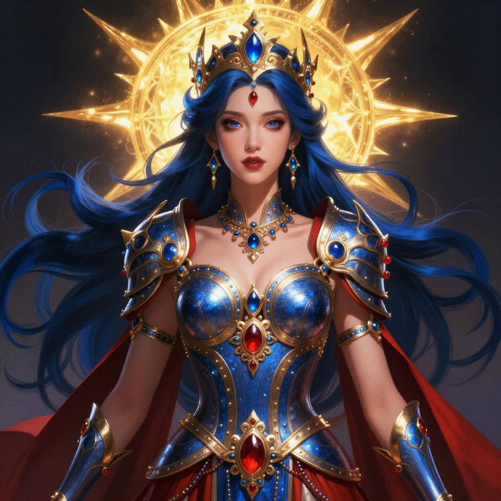 A striking digital illustration of a regal woman adorned in elaborate, ornamental armor and jewelry with vibrant blue and red hues. Her flowing dark blue hair and the glowing golden sun halo behind her create a powerful and mystical aura, blending fantasy and mythological art styles.
