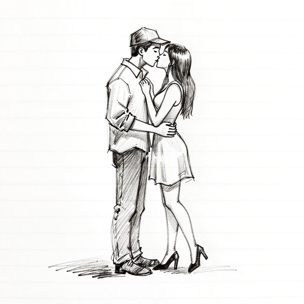 This is a black-and-white pencil sketch on lined paper. It shows a couple standing close, about to kiss. The man, with short hair and a hat, is wearing a long-sleeve shirt and pants. The woman has long hair and is wearing a short dress with high heels. They're standing with their foreheads touching, creating an intimate vibe. The sketch has a rough, sketchy style.