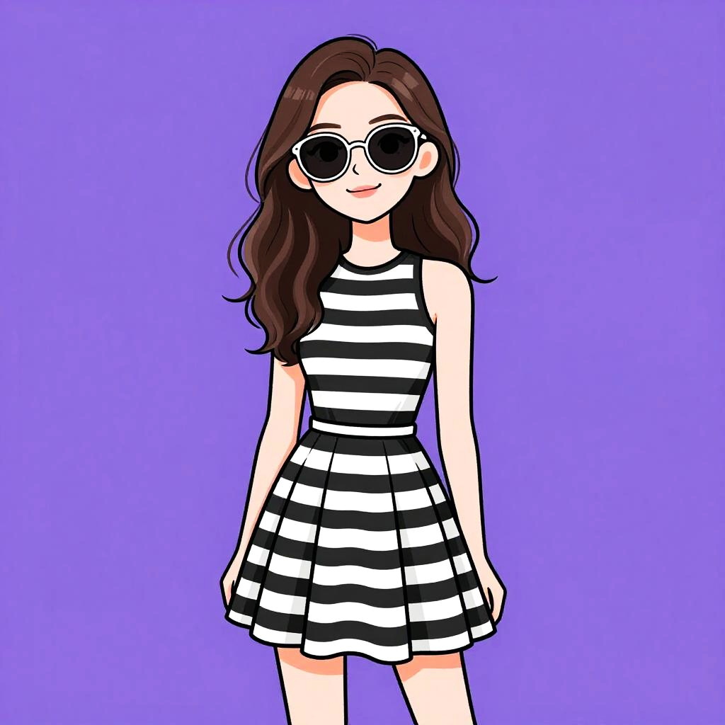 Woman with pretty face and pretty hair. Woman, casual, navy and white horizontal striped short dress, neon yellow trim on neckline and sleeves, round neckline, short sleeves, fitted silhouette, above-the-knee length, black sunglasses. --sref 1467