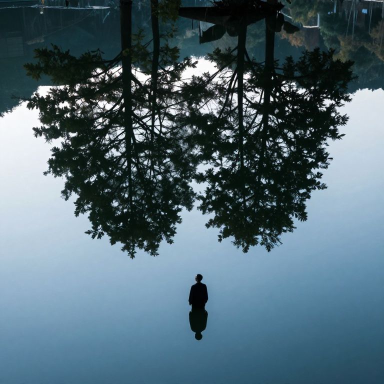 Silhouetted trees stand inverted above a tranquil lake, their mirrored roots extending downward into the water, while a lone figure stands below, gazing upward at the surreal, gravity-defying scene.