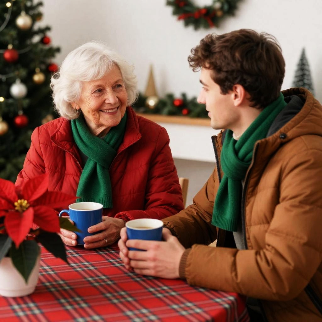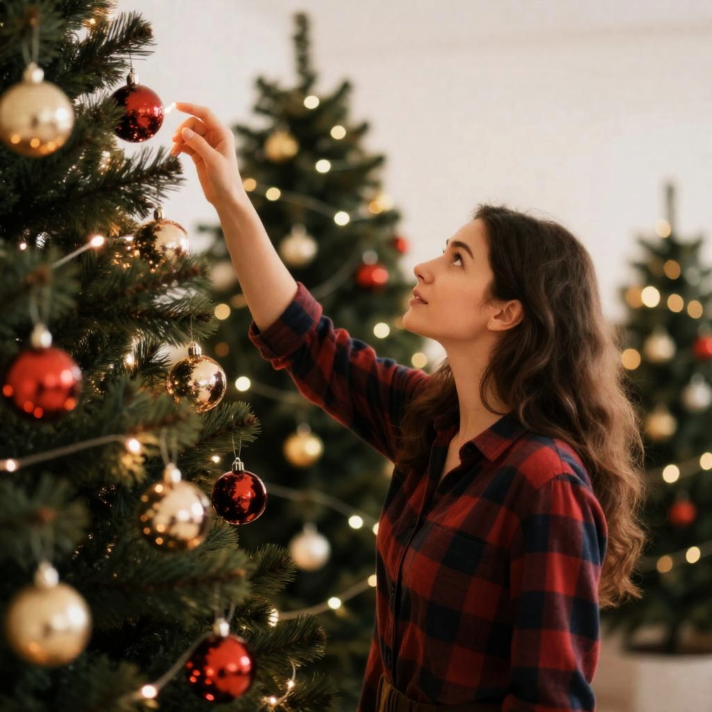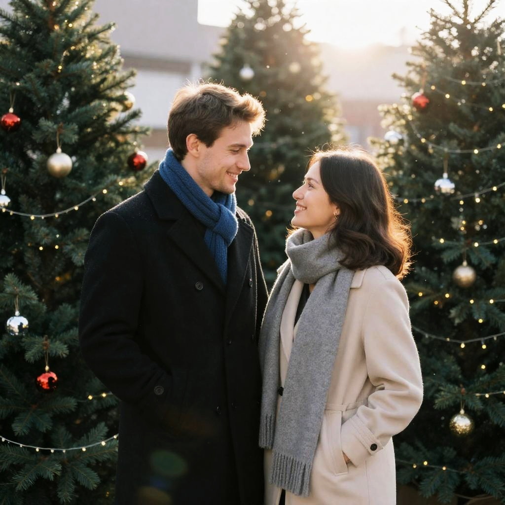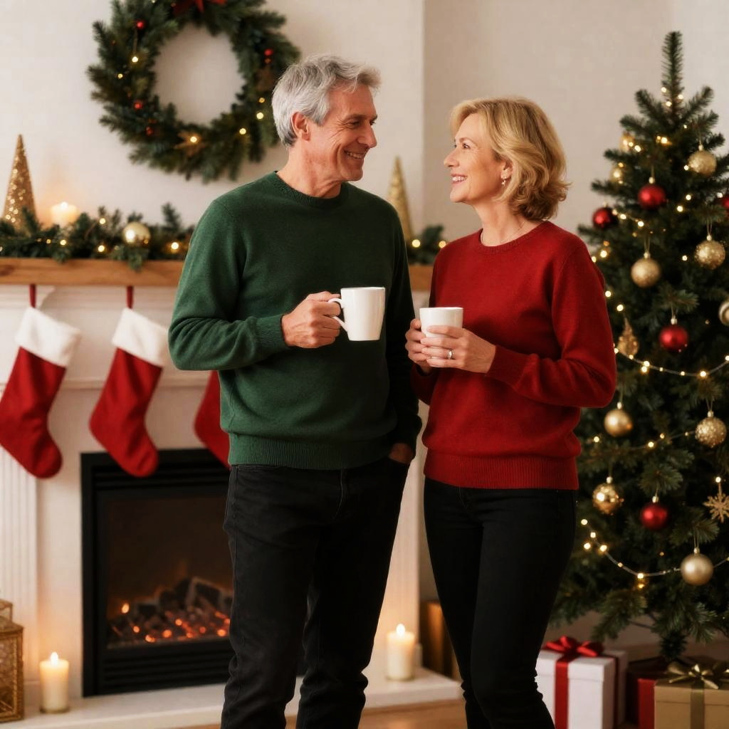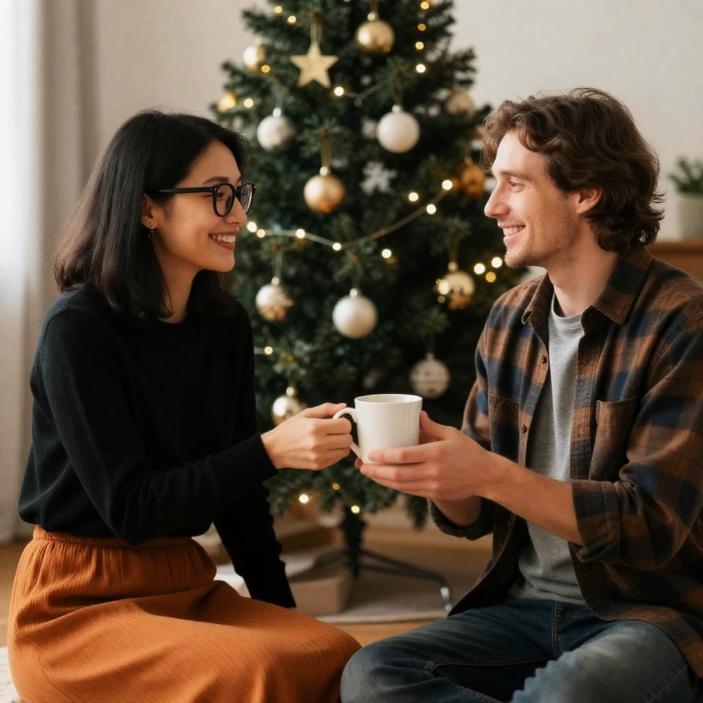 Photograph of a couple exchanging a mug. Woman with black hair in glasses, black sweater, and orange skirt, smiling. Man with shoulder-length brown hair, plaid shirt, and gray t-shirt, smiling. Christmas tree with lights and ornaments in background. Man holding mug, woman extending her hand. Warm indoor setting.