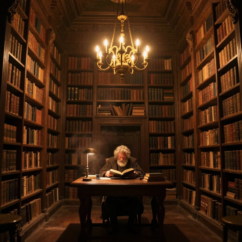 Illustrate image of an ancient library filled with towering shelves of old books, warm golden light from chandeliers, a scholar reading at a wooden table, dust particles in the air, highly detailed interior, cozy atmosphere, vintage fantasy realism