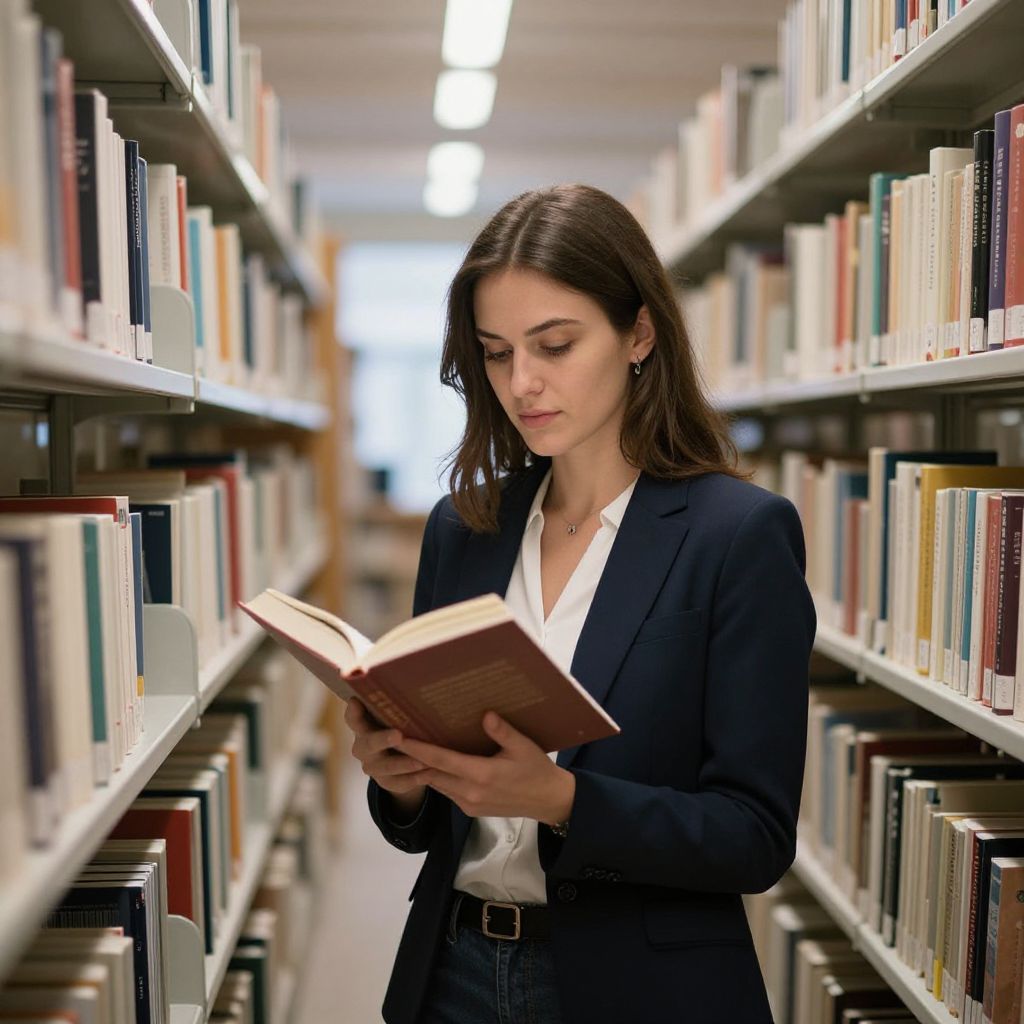 Photograph of a young woman with long brown hair, wearing a black blazer and white shirt, reading a book in a brightly lit library aisle.