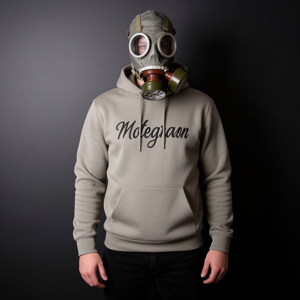 Photograph of a man in a grey hoodie with "Mongern" text, wearing a gas mask, against a dark blue background.