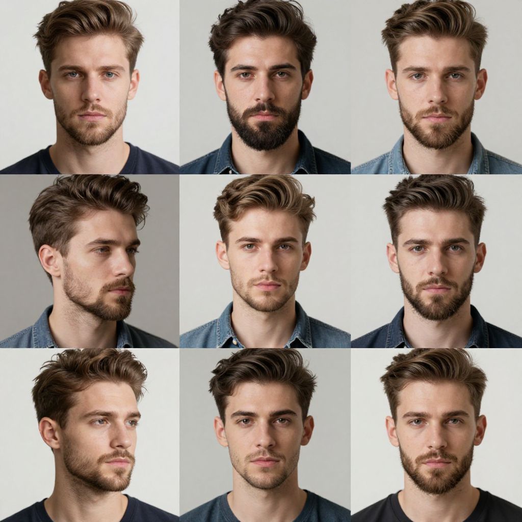 Photograph collage of nine headshots of a white male with brown hair, light stubble, and blue denim shirt, showcasing various hairstyles and expressions against