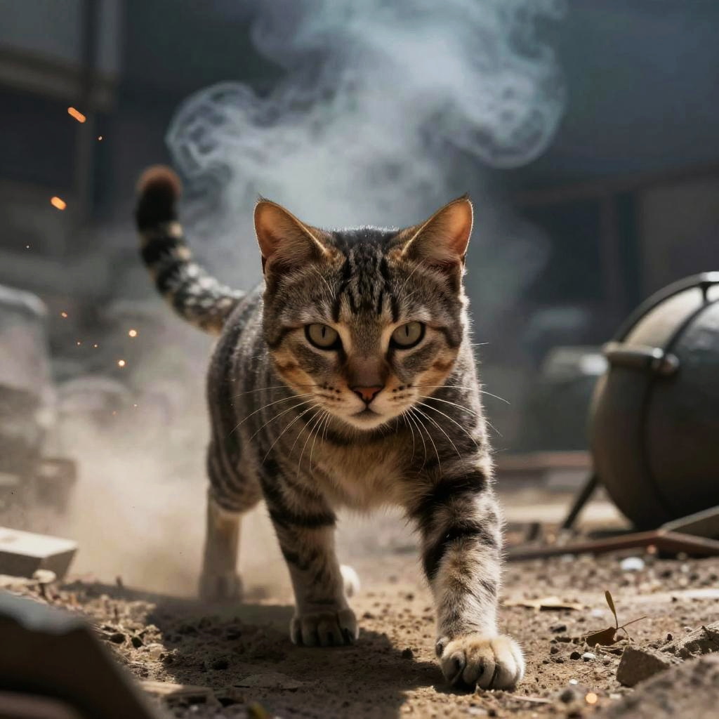 CSGO cat agent sneaking through a bomb site, sleek fur, intense gaze, smoke and sparks in the background, cinematic action scene