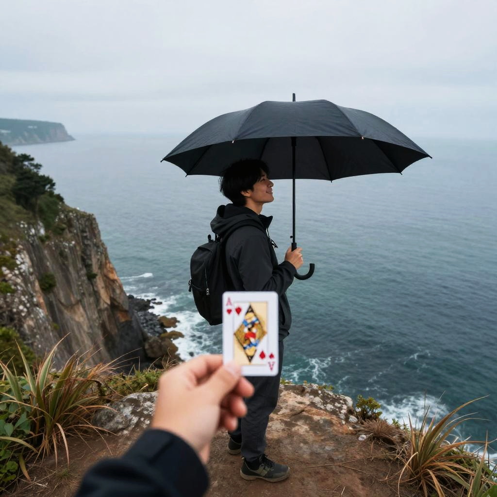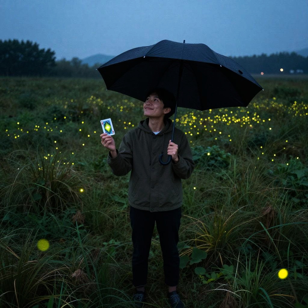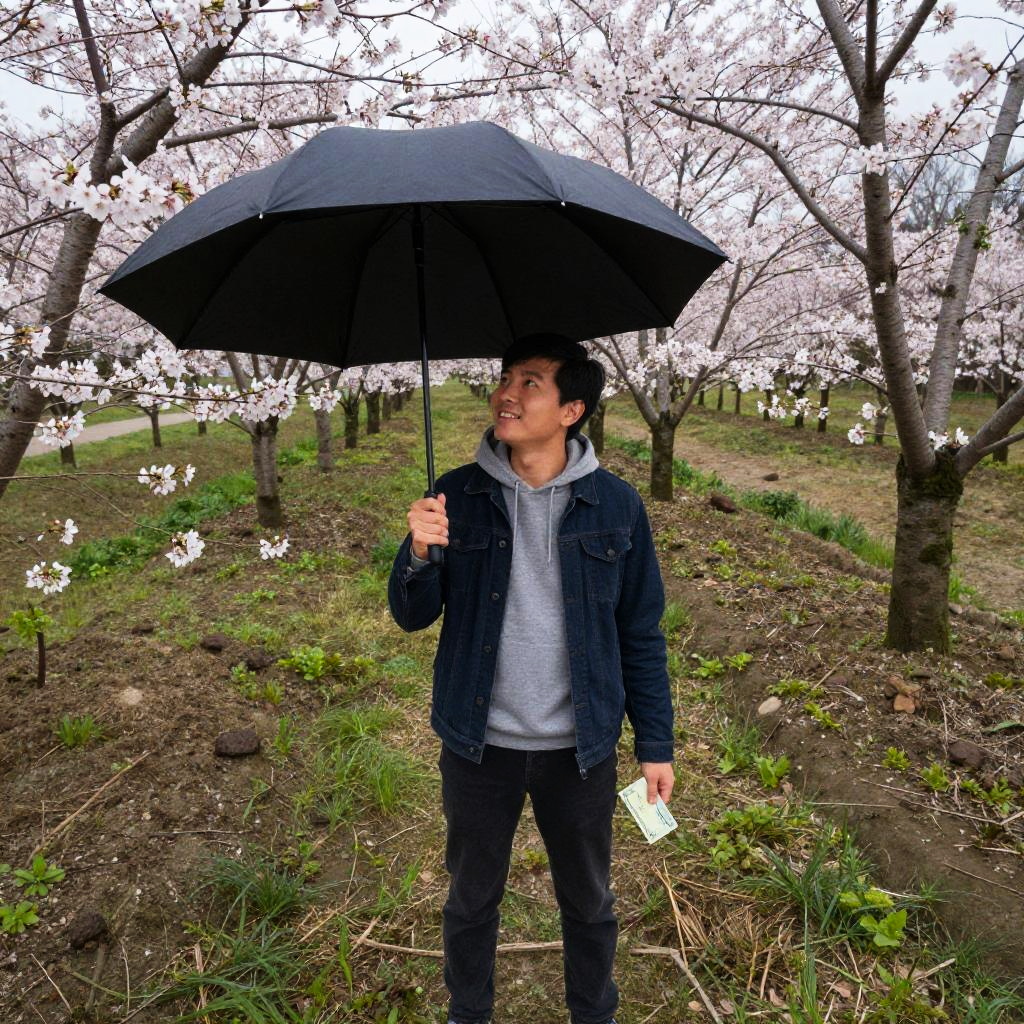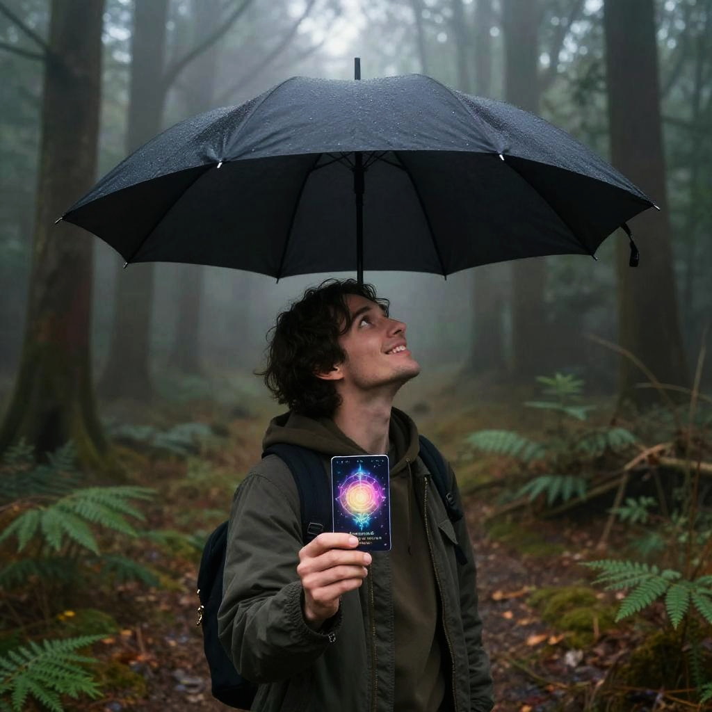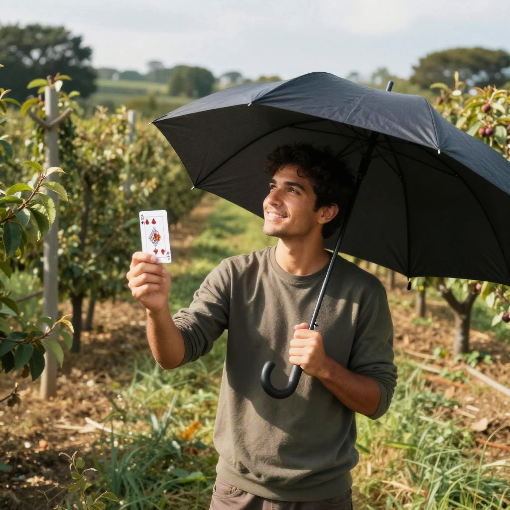 Drone shot of a figure in a bustling city park, holding an umbrella and looking at the sky with a smile, with the success card in hand, against a peaceful natural backdrop.