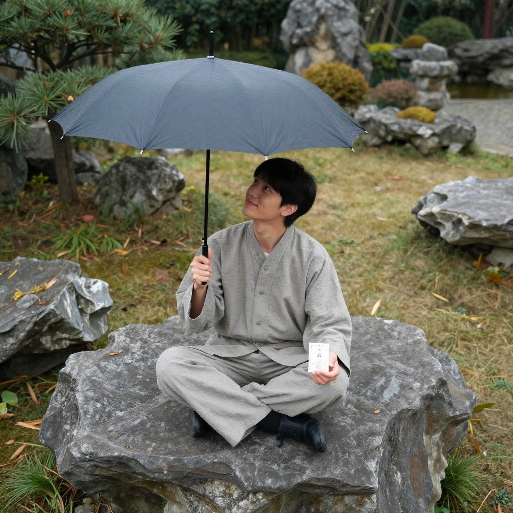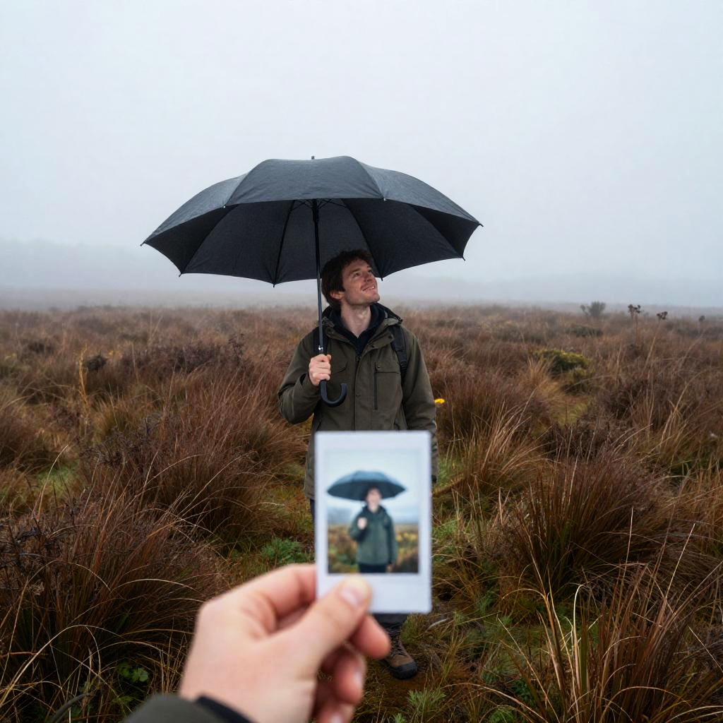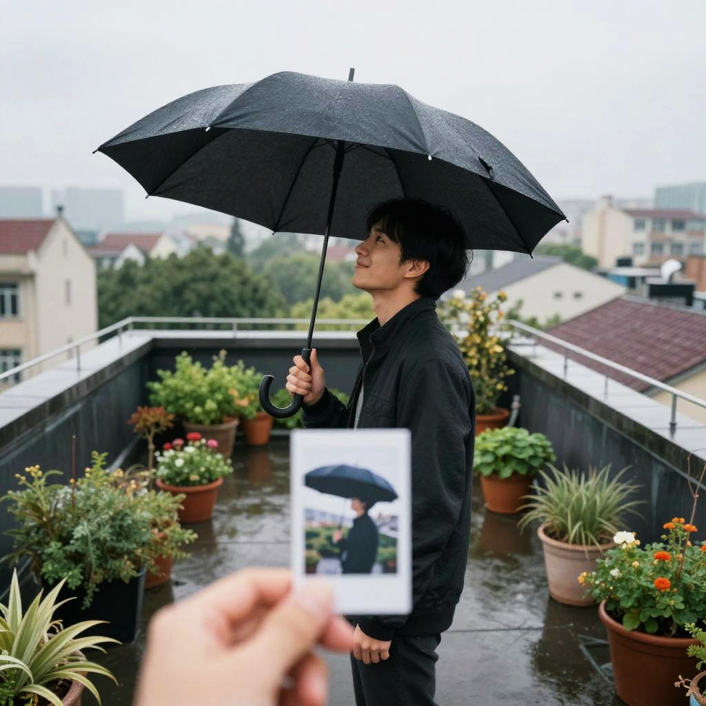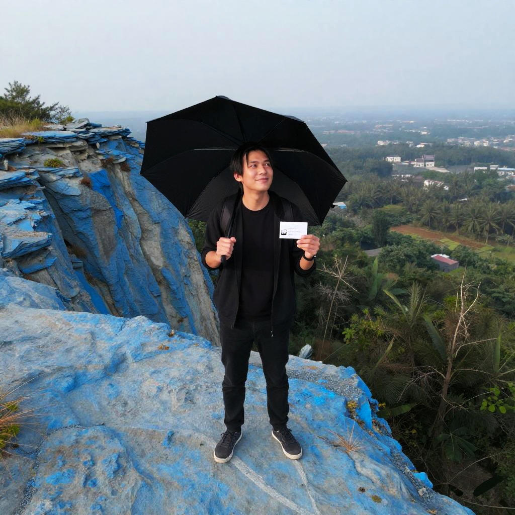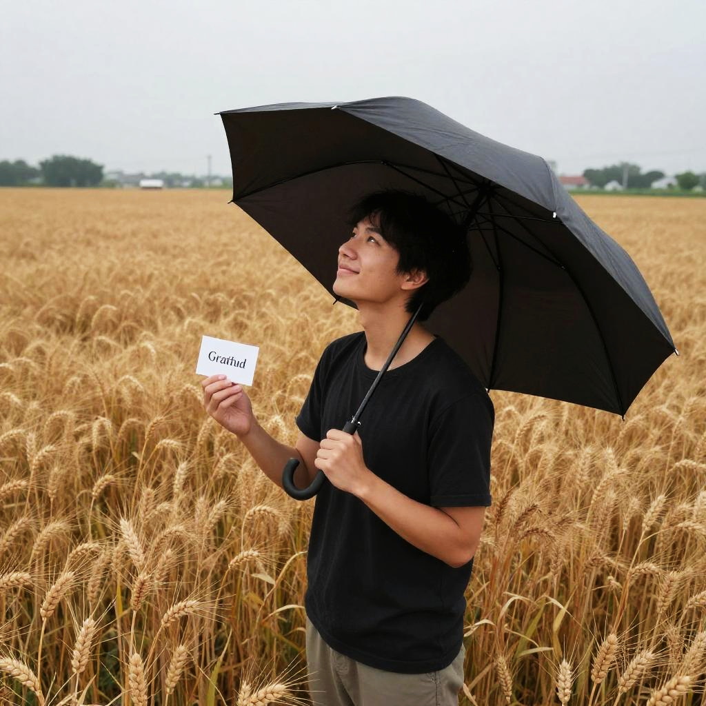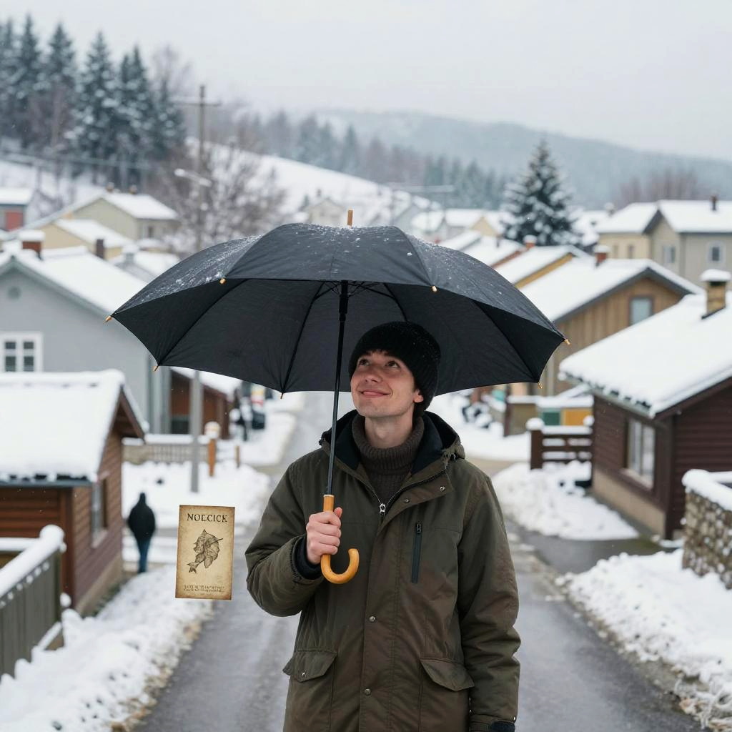Drone shot of a figure in a bustling city park, holding an umbrella and looking at the sky with a smile, with the success card in hand, against a peaceful natural backdrop.