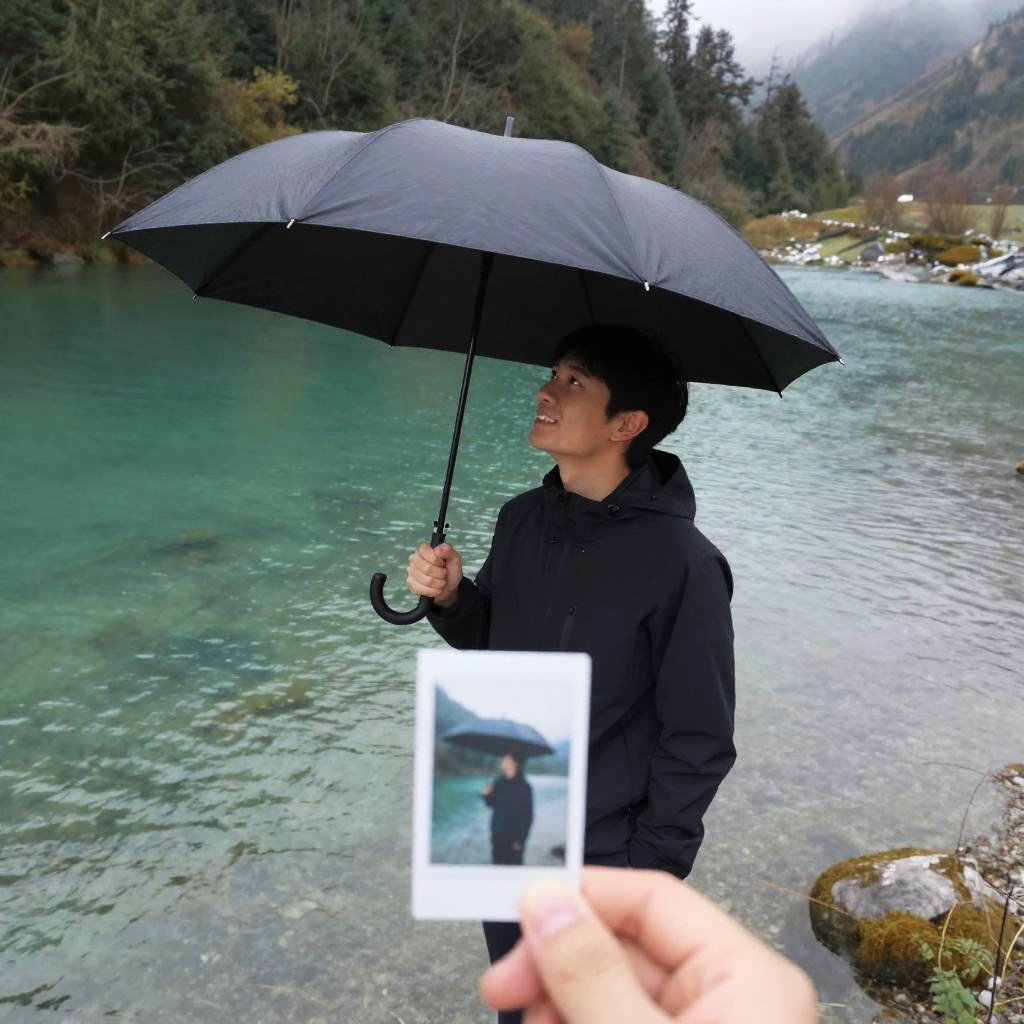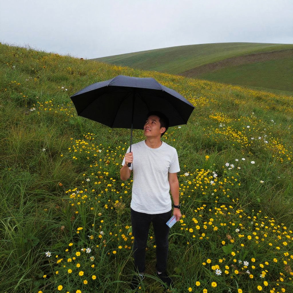 A black figurine holding a bright yellow umbrella and a briefcase standing on lush green grass in a spacious city park. The park features a calm reflective pond surrounded by vibrant green trees and a distant tall tower. The image conveys a blend of urban and natural elements with a serene atmosphere on an overcast day.