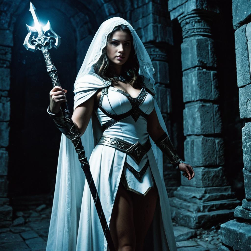 Fantasy, temple, ruin, thigh-up, 1girl, solo, veil, close-up, holding staff, night, white dress, dungeon, cleric, casting light magic, shoulder armor